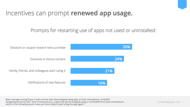 We’ll pull our numbers from a recent study published by Google called “Mobile App Marketing Insights.” The report analyzes consumption, discovery, downloads, behaviors, and abandonment – but who has time to read through all of that?