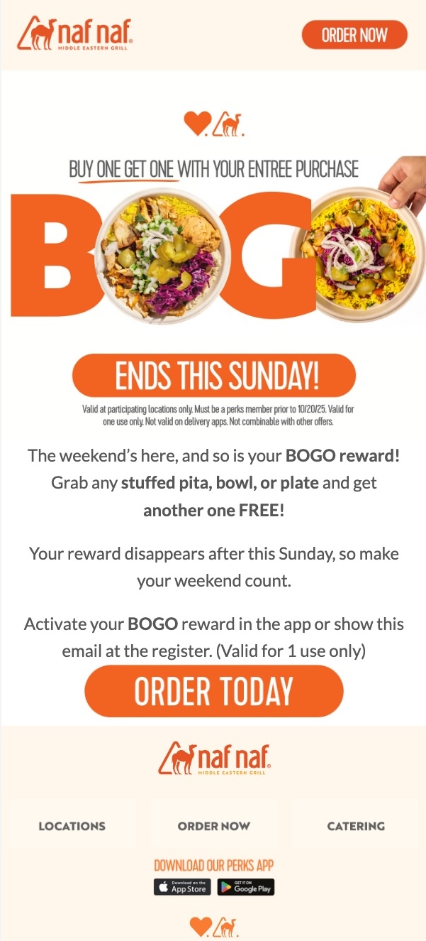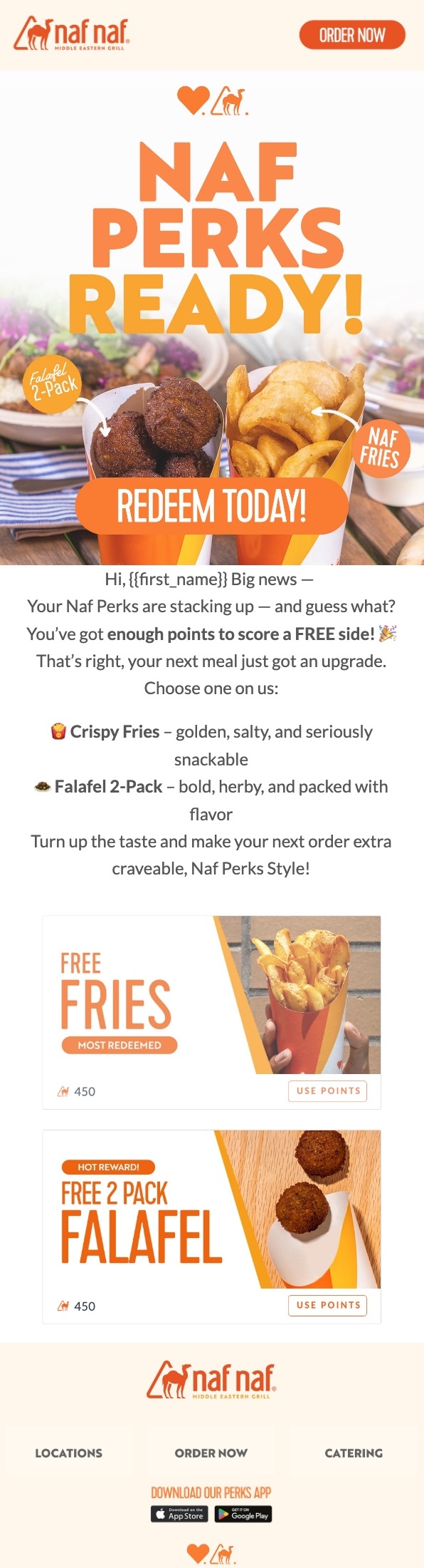 Naf Naf Grill promoted its rewards marketplace via email and push to showcase new reward options, helping first-timers and regulars discover appealing ways to redeem.