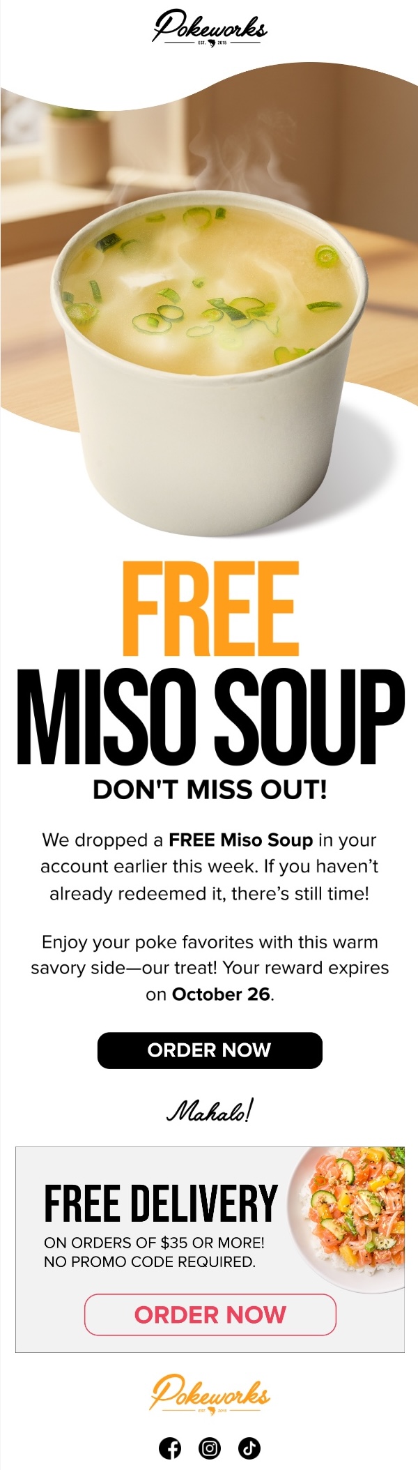 Pokeworks ran a reward-reminder email campaign to surface available rewards ahead of dinnertime and key occasions, driving more repeat orders from existing members.
