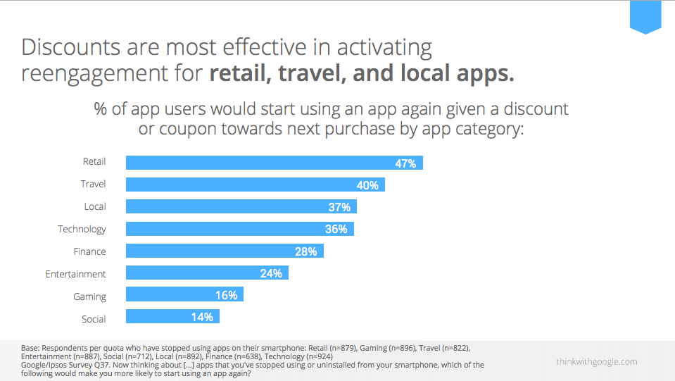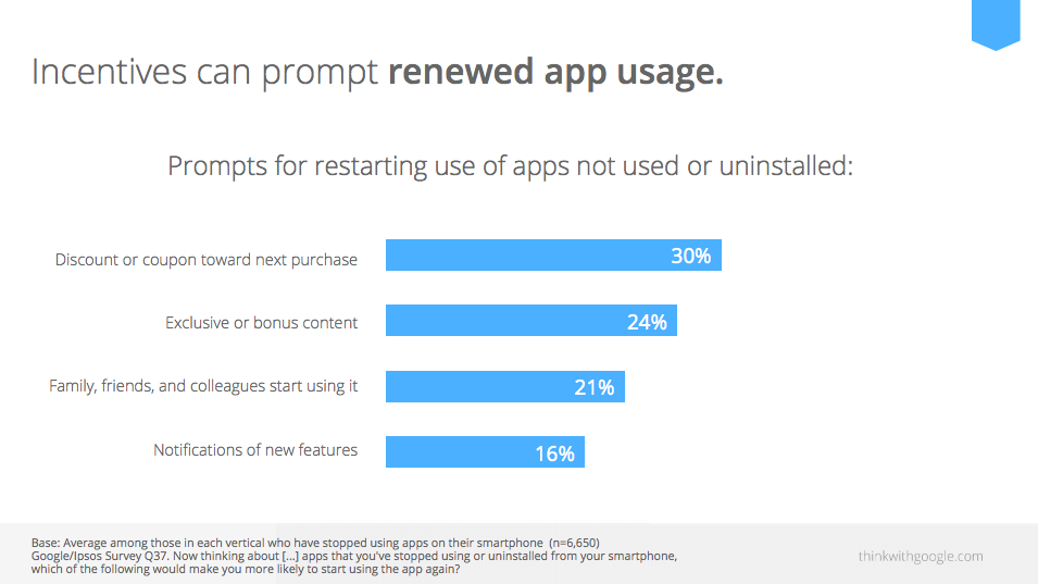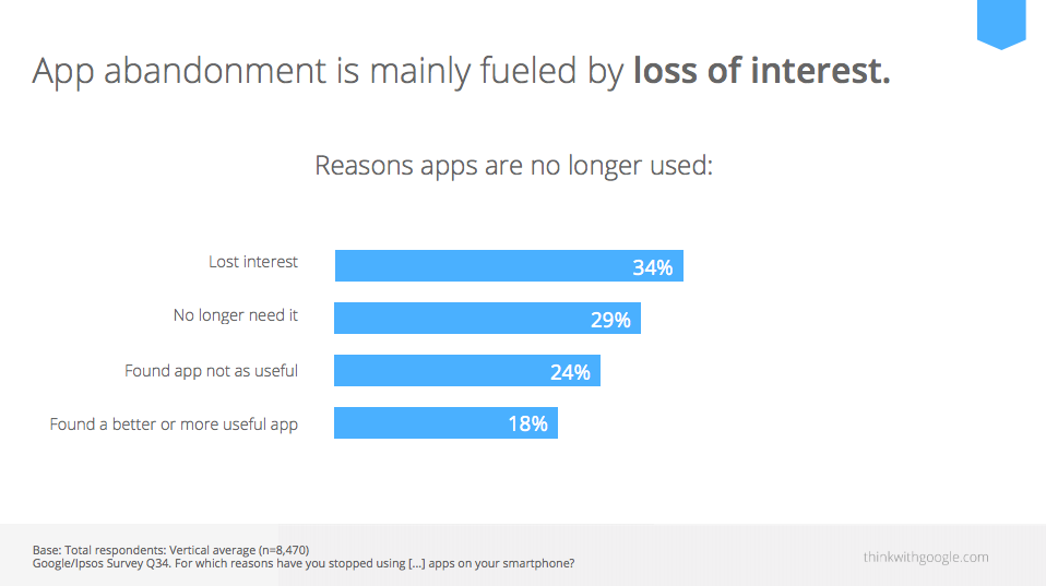 Ever wondered what it takes to build an app that tons of people download AND use? Welcome to a not-so-exclusive club. Statista predicts that app downloads will hit ~270 billion in 2017.So, let's take a look at the numbers behind consumers' use of apps to figure out exactly what's working, what's not, and what to do if you want to build an app your customers will love.We'll pull our numbers from a recent study published by Google called "Mobile App Marketing Insights." The report analyzes consumption, discovery, downloads, behaviors, and abandonment – but who has time to read through all of that?Here are the five most important stats governing that which makes an app successful (i.e. downloaded AND used).