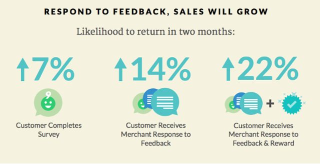 Make it possible — nay, make it easy— for customers to leave feedback in a hassle-free way. Feedback is a crucial component of any holistic loyalty program — customers who give feedback and receive responses are about 15% more likely to return to your business than customers who don't. Make sure that you’re responding to feedback with haste and taking customer’s suggestions into consideration.Additionally, when feedback is tied to transactional data, merchants can quickly identify issues with service or product quality at specific locations, or take swift and impactful action when a complaint is lodged from an individual with a high lifetime value. For this reason, simply responding reactively to bad reviews on Yelp isn’t enough to engender those warm, fuzzy feelings of loyalty.How can restaurants make sure their customers feel heard? Right after customers complete a transaction, send a mobile survey at random asking customers to rate their experience. If customers do give feedback, respond! Because you know exactly which customers (spending an exact amount of money over an exact period of time) reviewed your business, responding becomes much more productive.