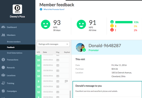 The reason Dewey's guests leave feedback at rates that are triple the industry average is because they prompt customers to leave their remarks via smartphone after every transaction via their mobile loyalty program. This means that customers are only leaving feedback when it's relevant to them (right after a purchase, preferably when they're stuffed full of delicious pizza), and they're doing it in a way that's convenient (right on their smartphones).