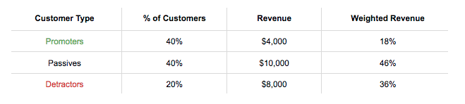Now you can see the kind of money that’s often left on the table. When we re-calculating NPS based on the weighted revenue data, the score from our examples ends up at -18. As NPS becomes weighted, it becomes much clearer that this business could stand to lose more than 70% of their revenue if Detractors and Passives are not addressed.