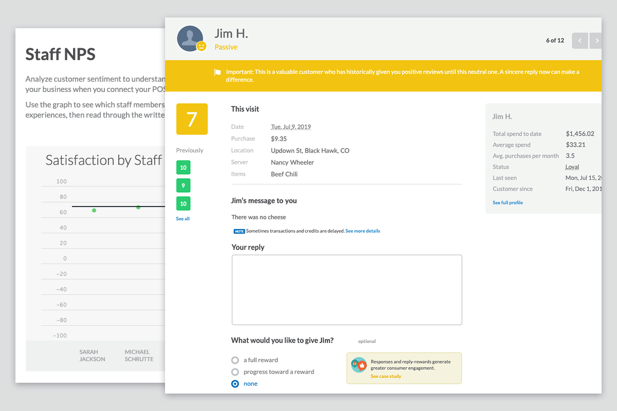 Item-specific data can be correlated with sentiment, offering helpful context to customer feedback. Staff-data can be aligned with customer NPS, as well, helping restaurants better understand staff performance as it relates to customer service.