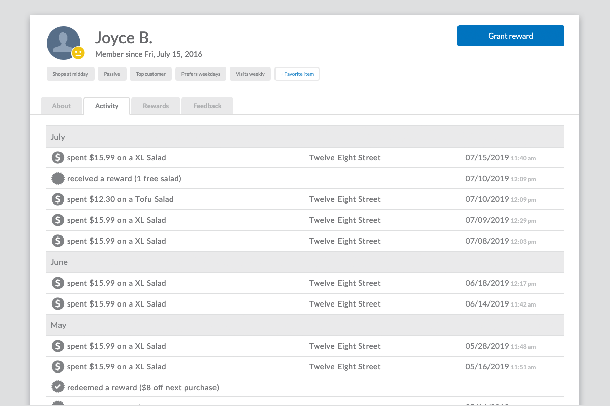 Thanx customers can view specific menu items purchased as part of a rich customer profile and can use that data to personalize how they engage with customers.