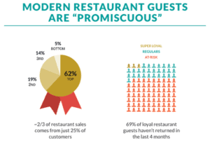 Modern customers are promiscuous, and loyalists are quite loyal. The importance of your loyal customers has never been greater. For restaurants (and other businesses) the majority of revenue is generated from a very active minority of your customers. However, 70% of your customers will visit once and never return.