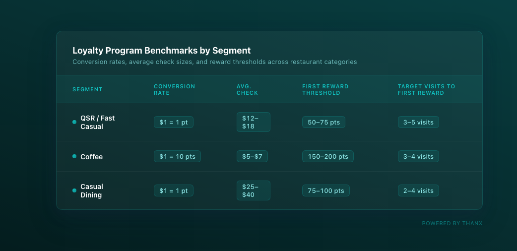 These are starting benchmarks, not prescriptions. Because Thanx allows real-time configuration, operators can test conversion rates, adjust reward thresholds, and respond to redemption patterns without waiting on a support queue. This helps treat the program as a continuous optimization engine rather than a set-and-forget system.
