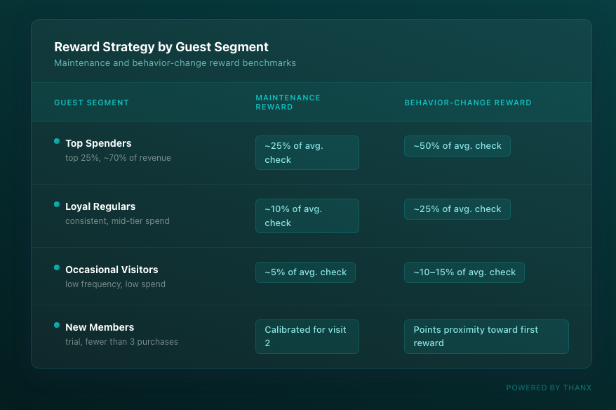 Reward value should scale with guest value and the magnitude of behavior change being requested. Top spenders warrant rewards worth approximately 25% of average check size for retention, and up to 50% when requesting a significant behavior shift. Loyal regulars respond well to 10% maintenance rewards. Occasional visitors need only 5% of average check to maintain engagement. Matching reward generosity to guest value and behavioral ask is what keeps effective discount rates low while driving real outcomes.