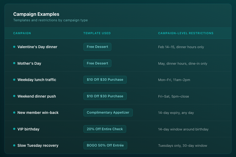 The template is always the same. The campaign wraps it in the restrictions that make it relevant to that specific goal. The restaurant launches seven distinct campaigns with five reusable builds and every future campaign that needs a free dessert already has one waiting.