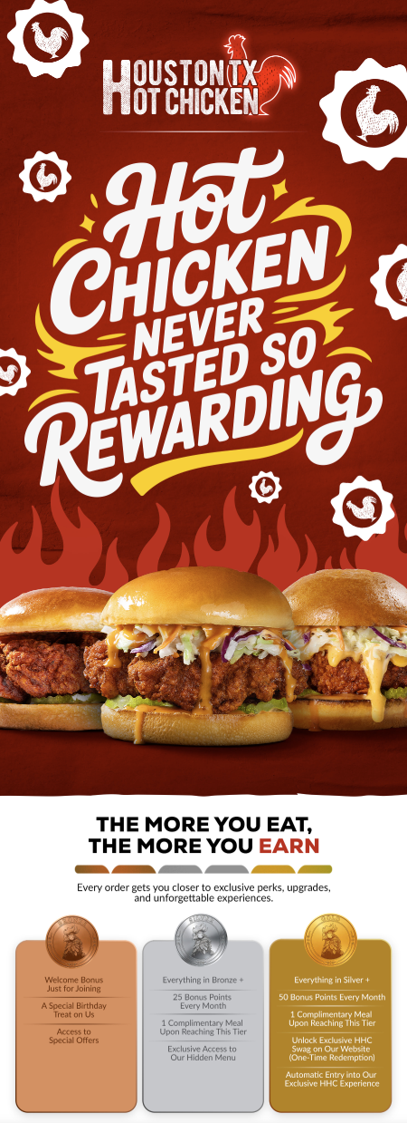 Leveraging their strong brand identity, Houston Hot Chicken launches Tiers with themed assets across app, email and website. Guests who unlock Silver and Gold tiers gain access to perks like monthly bonus point drops, complimentary meals, HHC swag and exclusive HHC experiences.
