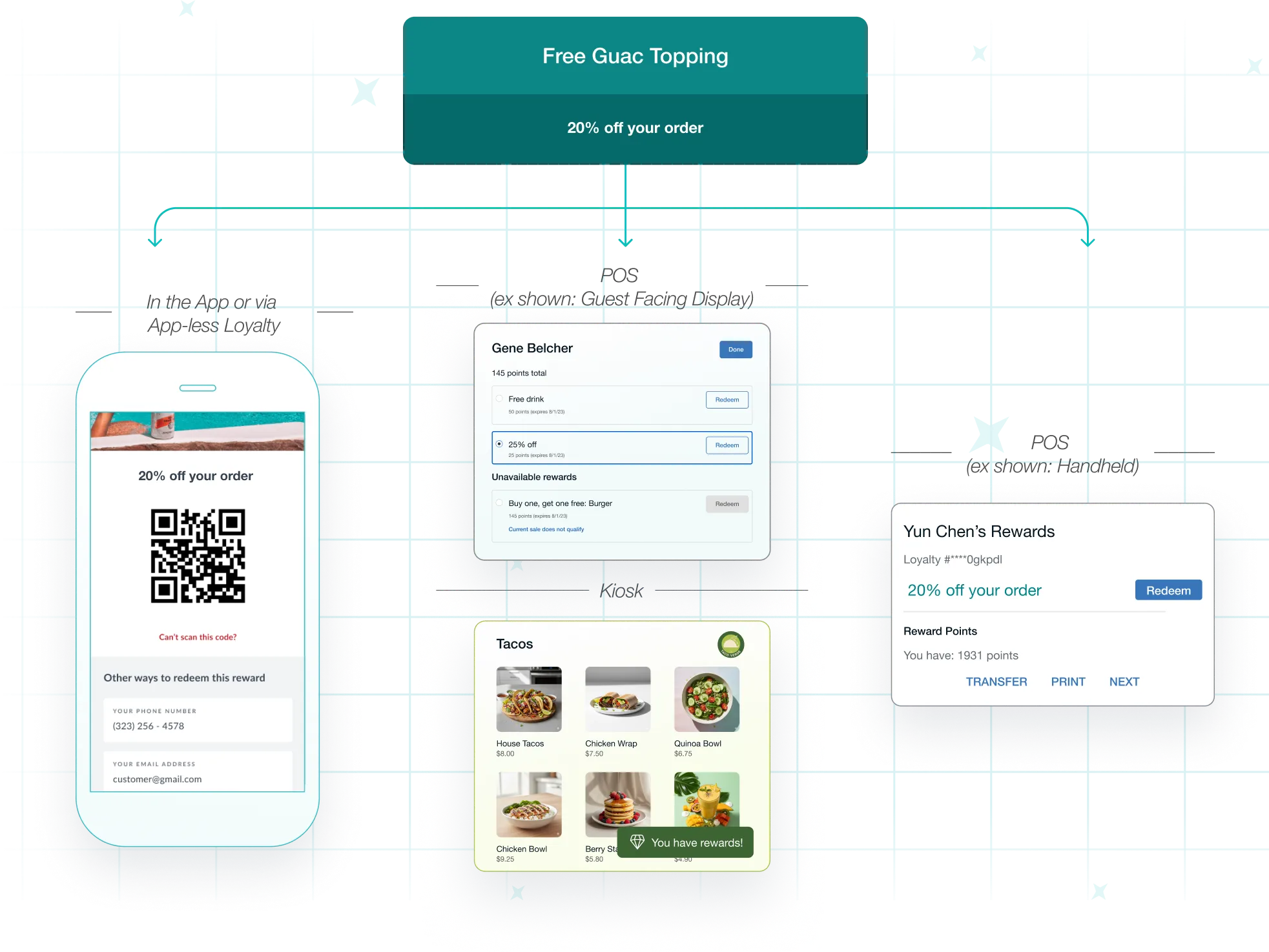 - Support every touchpoint: digital ordering, kiosks, tableside, and POS with card-linked or check-in loyalty.