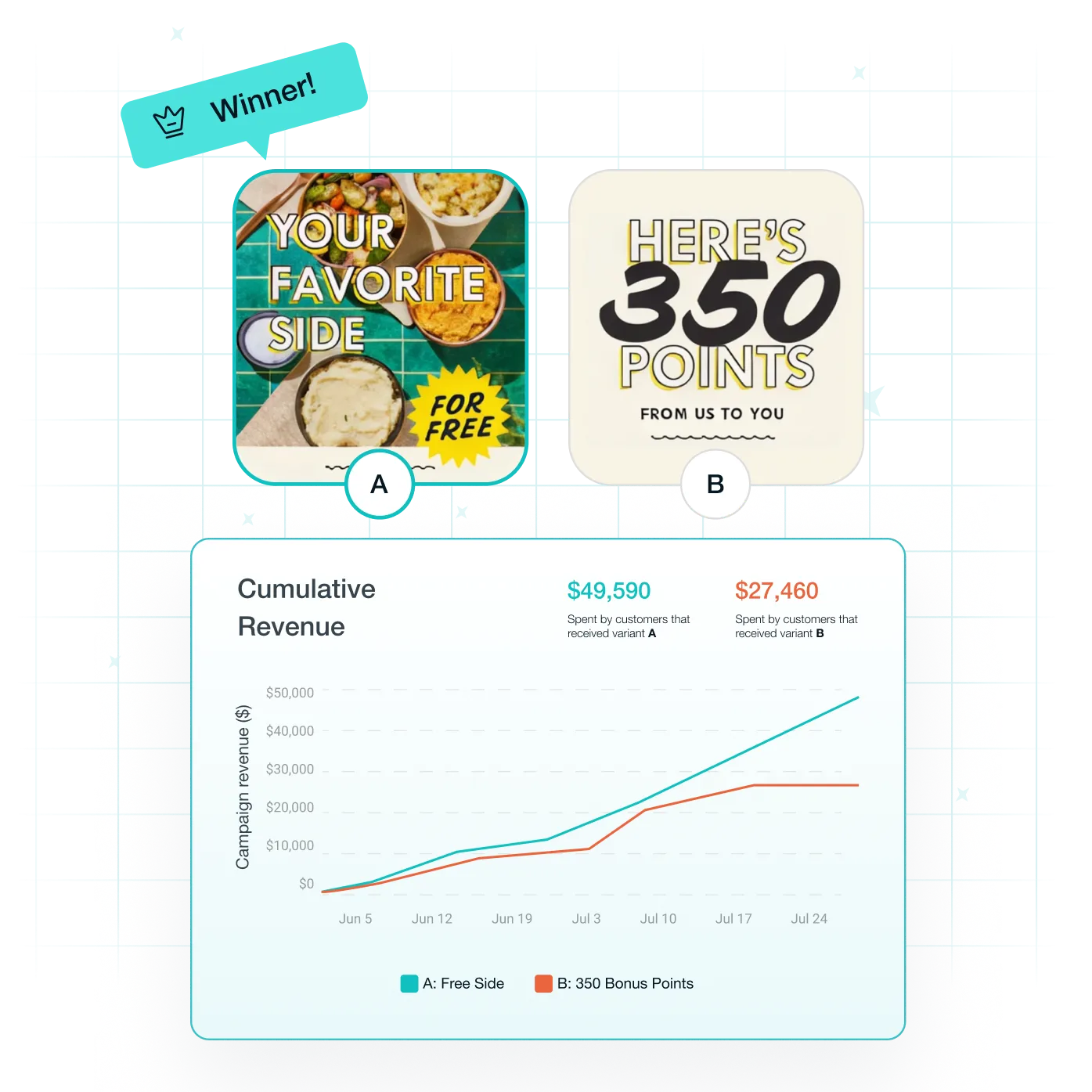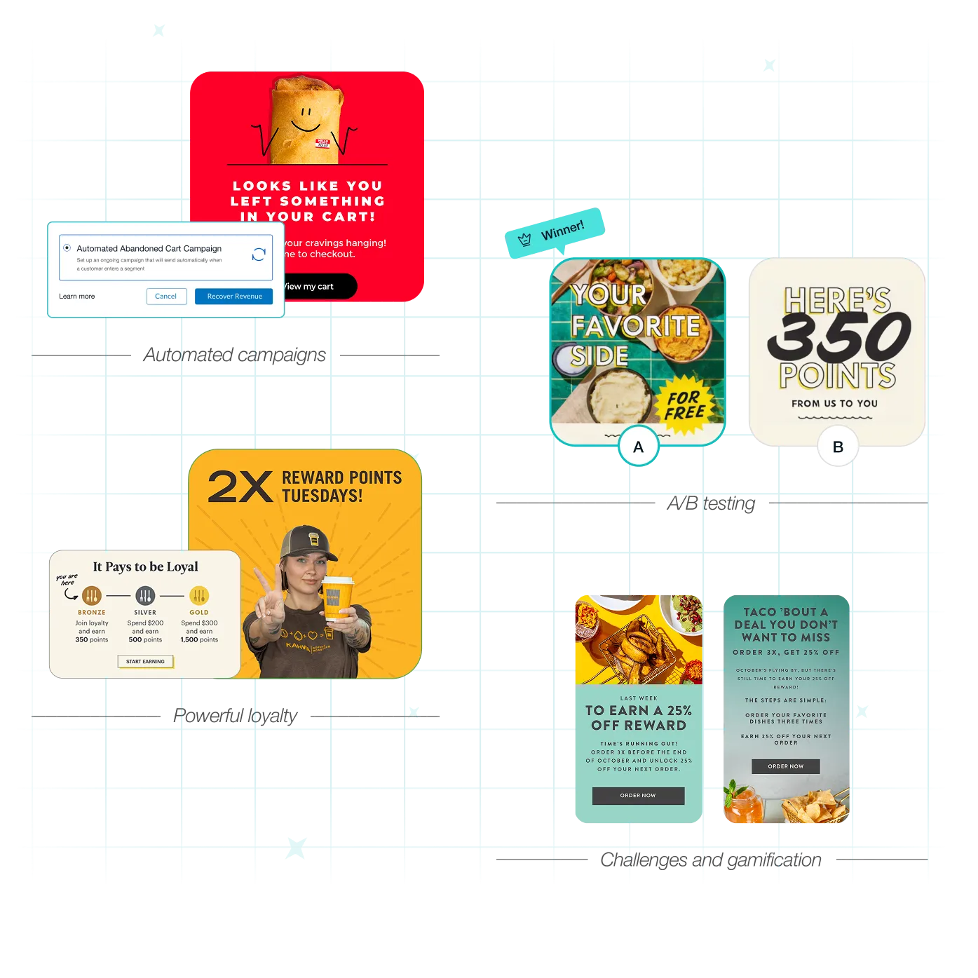 The most important features are those that make personalization easy and prove it works. AI-powered segmentation that builds audiences in seconds, not days. Automated campaigns that trigger based on real-time behavior: abandoned carts, lifecycle stages, purchase patterns. Ordering-integrated automations like item-level rewards that competitors can't match. And critically, built-in A/B testing with control groups to prove incrementality and optimize for both frequency and profitability.