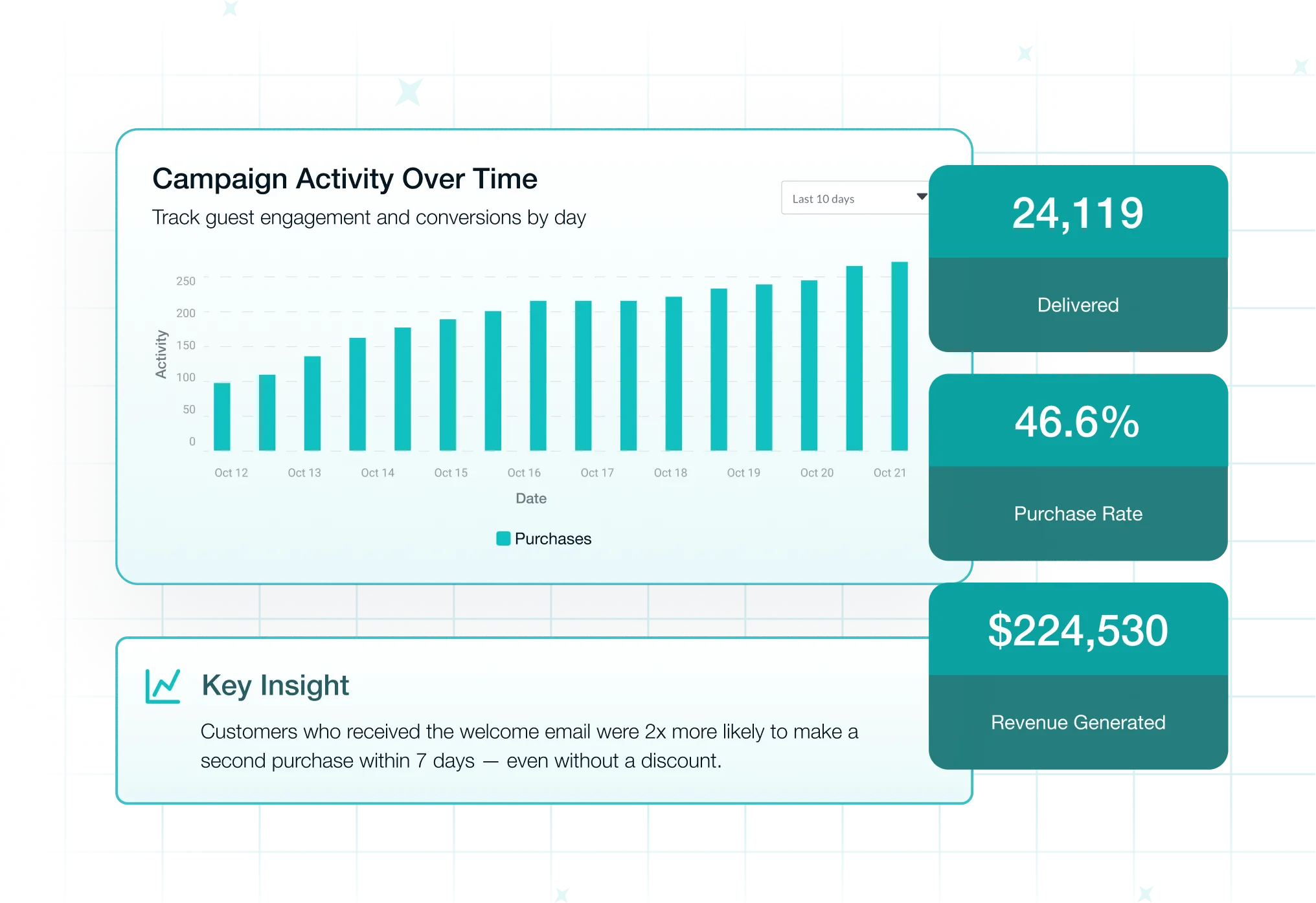 Deploy prebuilt lifecycle flows from activation through habit-building with configurable triggers and goals that turn new customers into regulars.