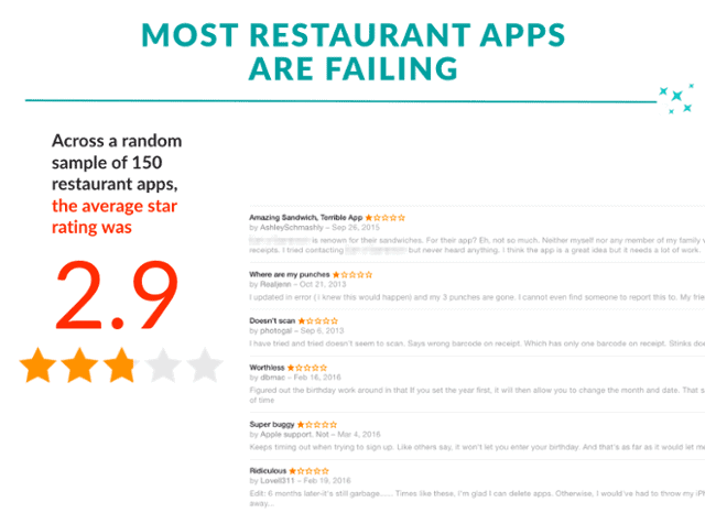 As a result, good brands have saddled themselves with bad apps — in a sampling of 150 restaurant apps, the average star rating was 2.9. Most restaurant operators would be unsatisfied with a 2.9-star review on Yelp, so why is this low standard of quality acceptable in the app store?